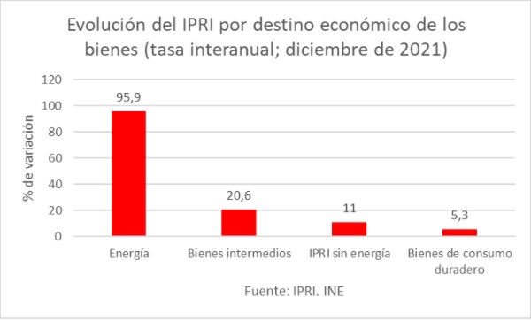 El incremento de los costes de la energía es de un 95,9%, también la más alta desde el comienzo de la serie; del mismo modo, los bienes intermedios, es decir, aquellos bienes para poder fabricar los bienes finales, suben un 20,6% interanual, también la mayor tasa de crecimiento desde 1976. Que la energía está influyendo de manera importante es algo obvio, pero el problema es que ya se está transmitiendo a toda la cadena de producción, pues el IPRI sin energía crece un 11% interanual (el mayor crecimiento desde octubre de 1984), que denota una fuerte presión de los precios industriales incluso sin tener en cuenta el componente energético.