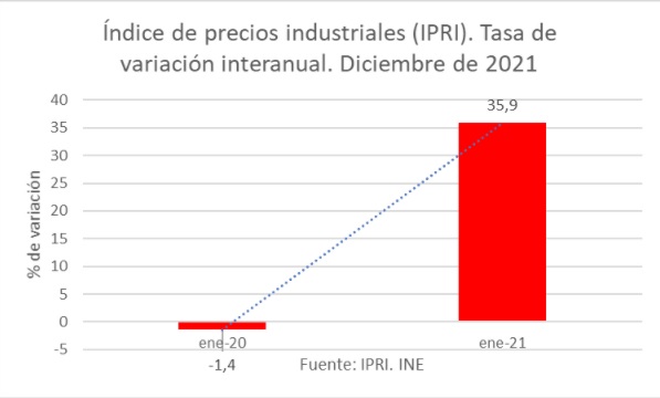 El Instituto Nacional de Estadística (INE) ha publicado el Índice de Precios Industriales (IPRI), que no sólo ratifica, sino que intensifica el exponencial crecimiento de los precios, en este caso de los precios industriales, al calcular para diciembre un crecimiento interanual de los mismos de un 35,9%, casi cuatro puntos más que el mes anterior, cuando en diciembre de 2020 caía un 1,4% interanual. Es la tasa más alta desde el inicio de la serie histórica en 1976. De la misma manera, el incremento mensual ha sido de un 3,8%.