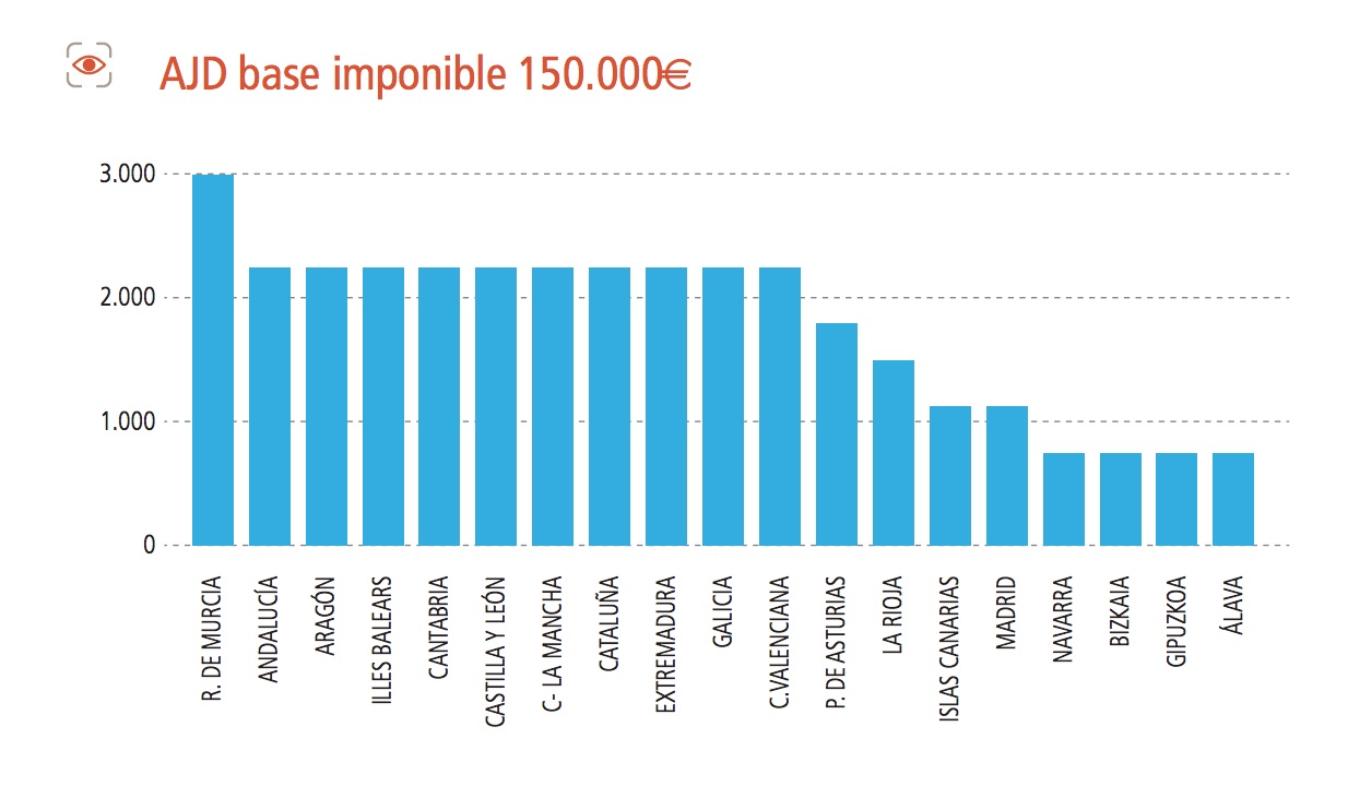 Actos Jurídicos documentados (ADJ): escriturar la compra de un inmueble nuevo de 150.000 euros, sin que vaya a constituir la vivienda habitual del adquirente, le costaría a un murciano 3.000 euros y a un madrileño 1.125 euros.