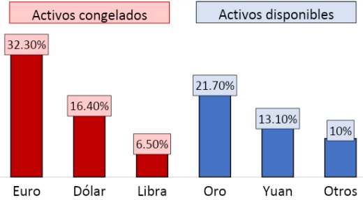 Por tanto, vamos a ver la moneda en la que están emitidos los activos que posee el banco central de Rusia para analizar el posible impacto de la congelación de sus cuentas por parte de algunos países occidentales.