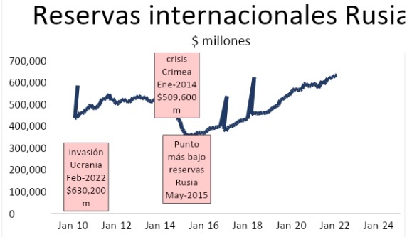 Vemos que en los últimos años la cuantía de las reservas se ha ido moviendo. Antes de 2014, la situación era de relativa calma, apenas había movimiento. Con el inicio de la invasión de Crimea en 2014, el banco central ruso empieza a "quemar" sus reservas monetarias. En apenas un año y medio las reservas caen de más de 500,000 millones de dólares a poco más de 350,000 millones, una caída de más de un 30% en sus reservas internacionales.