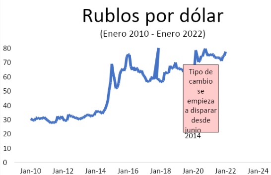 Es decir, por un lado, hubo sobreventa de moneda nacional por el miedo de la guerra y, por otro lado, la importación de dólares cayó por caída en el precio de las materias primas. Ambos movimientos provocaron un desplome en la cotización del rublo. La caída enorme del rublo ocurrió a pesar de que, como decimos, Rusia utilizó nada menos que el 30% de sus reservas para sostener el valor del rublo. Parece que las reservas rusas fueron suficientes para mantener al rublo durante un tiempo, al menos hasta mediados de 2014 (esto es lo que muy posiblemente van a evitar las sanciones que se acaban de imponer).