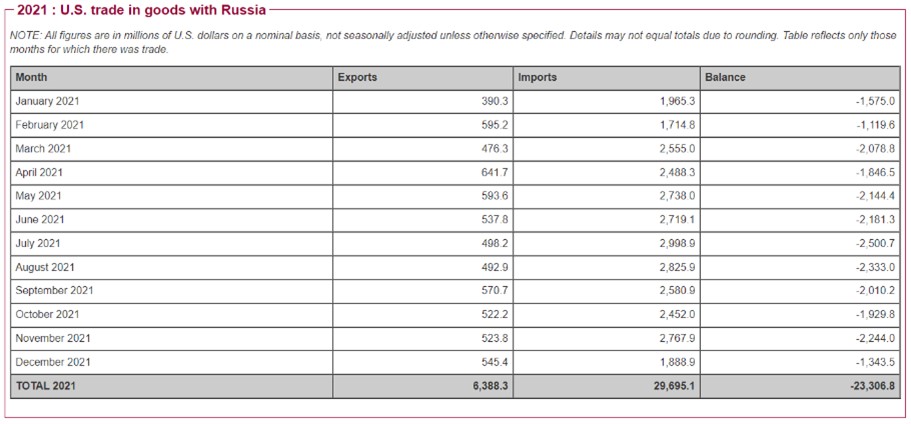 La exposición de Estados Unidos a Rusia es muy limitada, notablemente inferior a la de la Unión Europea. Rusia ocupa la posición 40 en el ránking de países destino de exportaciones de Estados Unidos. En 2019 (últimos datos disponibles), con un volumen total de 10.900 millones de dólares en términos de exportaciones de bienes y servicios y de 24.000 millones de dólares en importaciones. El déficit, por lo tanto, asciende a 13.100 millones de dólares.