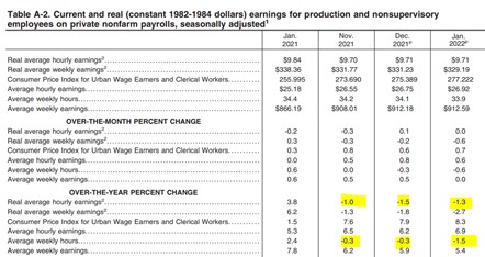 Lo que sí que está ocurriendo es una erosión notable del poder adquisitivo. Según la Oficina de Estadísticas, el salario medio por hora medido en términos reales (esto es, descontando el efecto de la inflación) lleva ya 3 meses en negativo en términos interanuales. El último dato que conocemos es una tasa del -1,3% en enero de 2022 con respecto a enero de 2021, mientras que el salario semanal está sufriendo también un retroceso cada vez más agudo, hasta el -2,7% interanual.