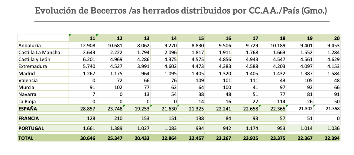 En términos porcentuales, las hembras aprobadas en tienta que pasaron al registro de la UCTL se reducen del 12% en 2011 al 9% en 2021, otro reflejo del efecto de la pandemia en el campo bravo. De igual modo, la evolución en la cifra de becerros herrados muestra una fuerte caída, pasando e 30.646 en 2011 a 22.394 en 2020.