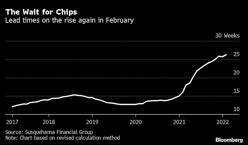 Sin embargo, según datos de la consultora Susquehanna facilitados por Bloomberg, el tiempo de espera en la entrega de semiconductores ha retomado su ascenso en febrero, haciendo que este ascienda hasta las 26,2 semanas, el doble que a comienzos del 2020.