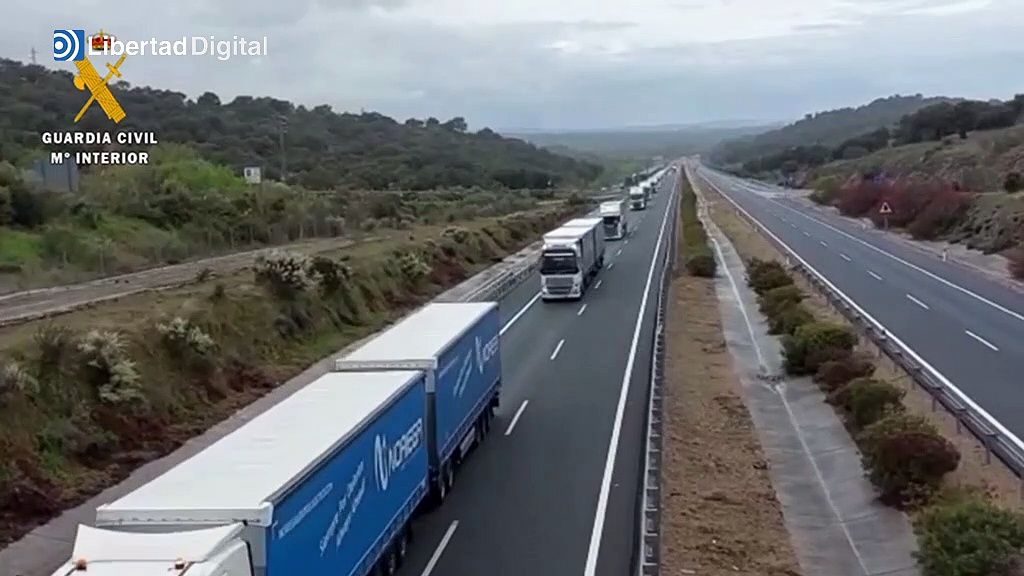 La Guardia Civil escolta un convoy formado por 23 camiones en la autovía A-66 a la altura de la localidad cacereña de Oliva de Plasencia.