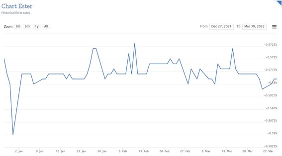 Por el momento, el tipo de interés a 1 día en los mercados interbancarios (ESTER) se mantiene estable, y eso es muy buena señal. Pero mucho me temo que si la morosidad comienza a subir, esto también se verá afectado.
