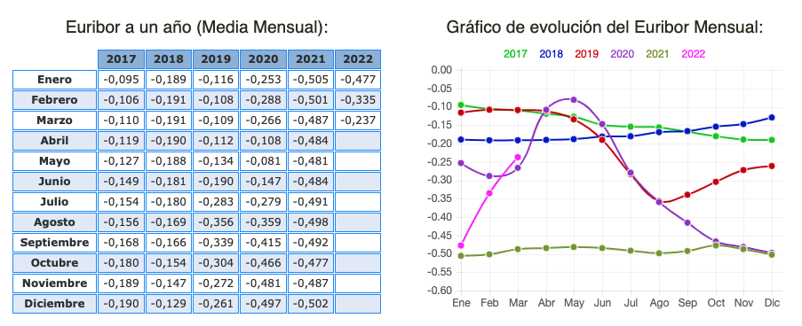 ¿Y cuál es el tipo medio histórico del euríbor a un año? Si nos remontamos a enero de 1999, en los últimos 23 años, 17 de ellos el euríbor ha estado en positivo. Y 13 de ellos por encima del 1%. Se sitúa la media histórica del euríbor alrededor del 3% y la situación anómala del tipo en negativo comenzó a finales de enero de 2016. Desde enero de este año, el indicador ha comenzado una tendencia alista importante, que le puede llevar de nuevo a terreno positivo y más si tenemos en cuenta que la tendencia lógica con las tasas de inflación que soporta Europa y EEUU, indique que los tipos de interés de referencia van a subir más rápido de lo esperado.