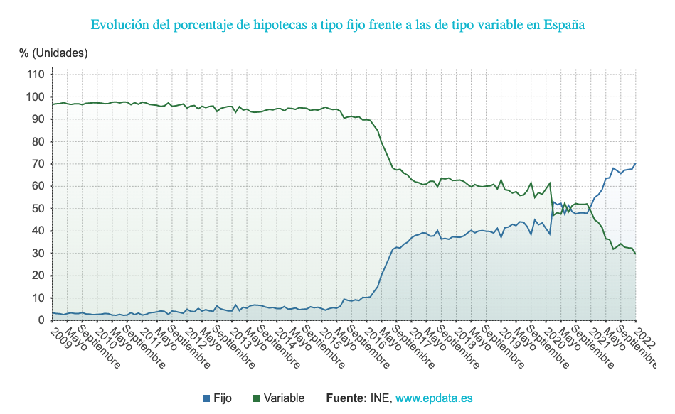 Esta realidad, unida fundamentalmente a la fuerte bajada de los tipos de interés fijo que han ofrecido las entidades financieras han hecho que el mercado se dé la vuelta como un calcetín, pasando de casi un 90% de hipotecas concedidas s tipo variable a que actualmente este porcentaje esté en el 30% frente a un 70% de hipotecas a tipo fijo. Hace sólo un año estaban igualadas en el 50% tipo fijo, 50% tipo variable.