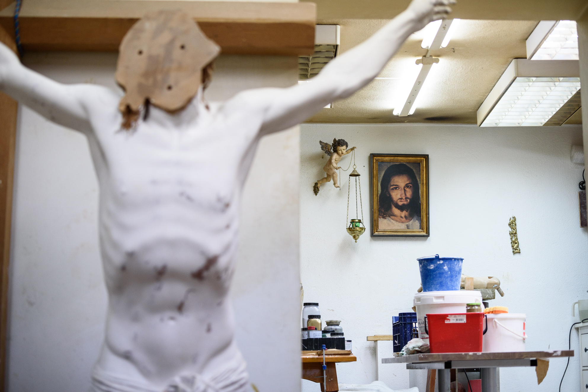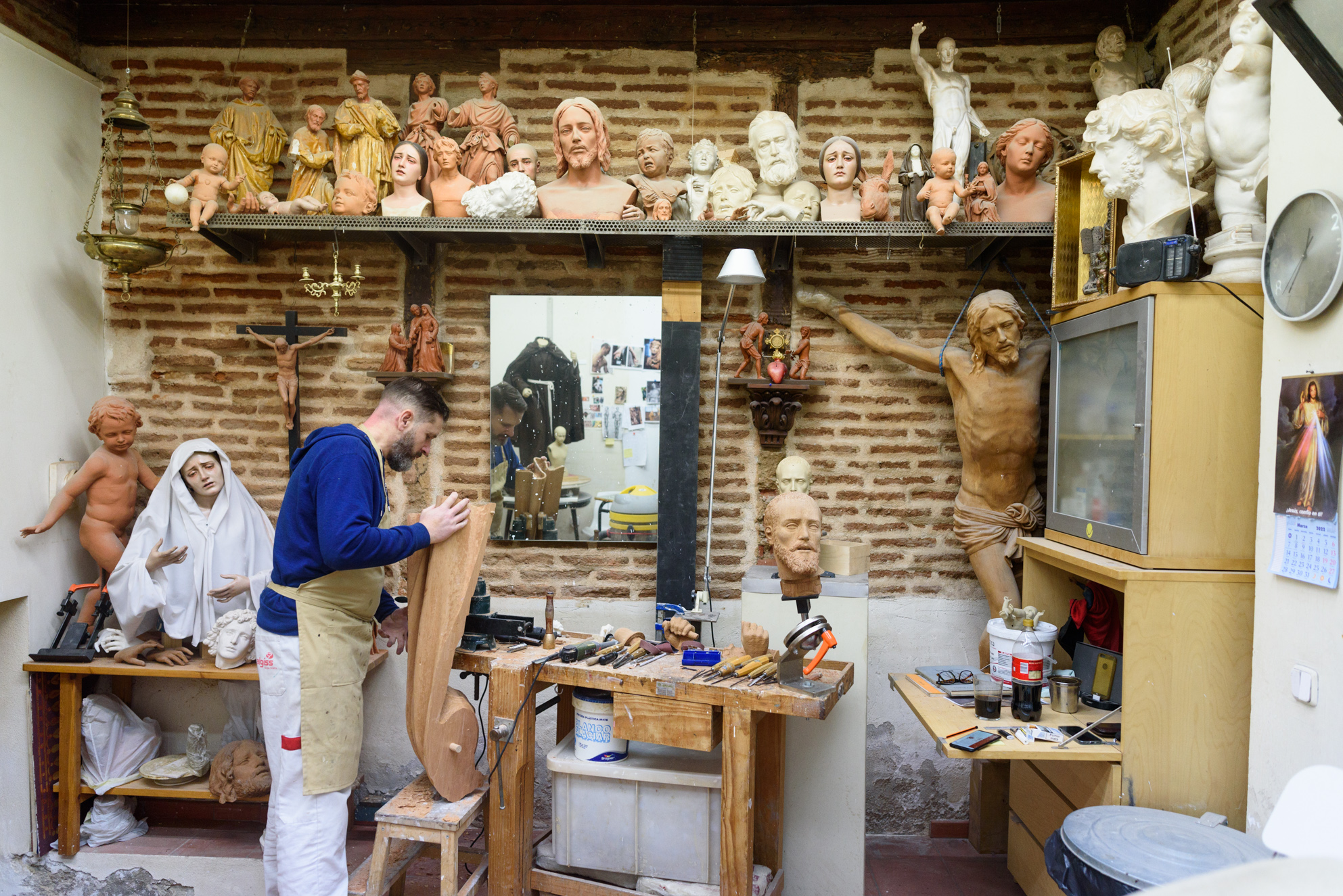 Una de las tallas de cuerpo entero aún sin terminar a falta del busto. Las imágenes religiosas siempre se trabajan por partes en el taller.