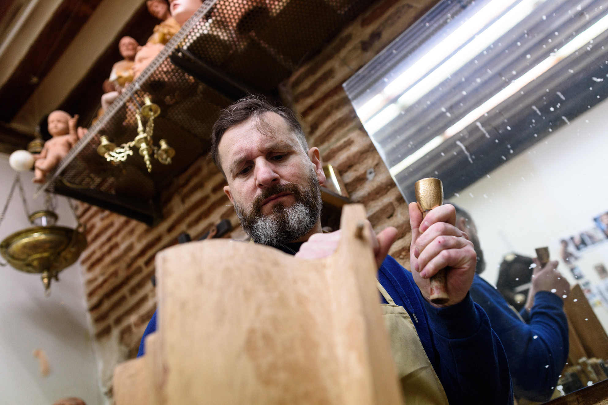 Antonio trabaja en su taller esculpiendo en madera de cedro lo que será su próxima obra.