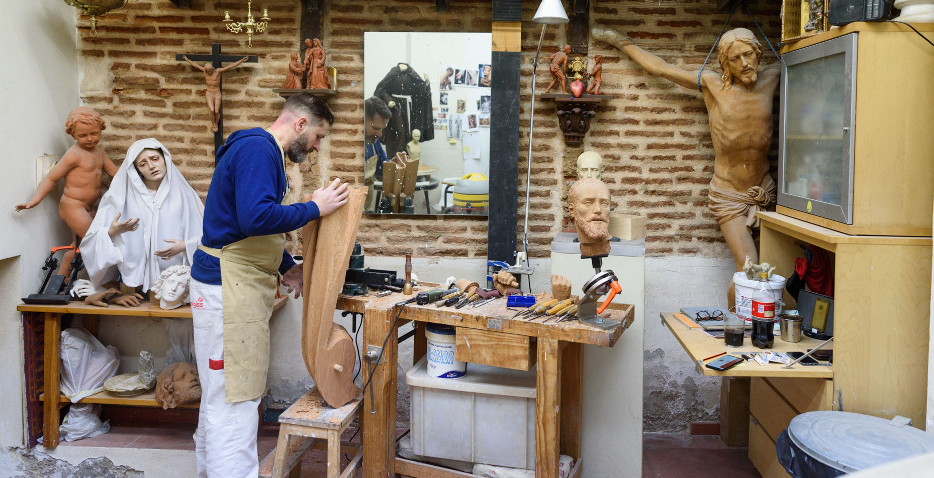Uno de los maestros escultores de este tipo de representaciones artísticas religiosas es Antonio José Martínez Rodríguez, imaginero autodidacta, andaluz de nacimiento y ahora afincado en la capital de España, con una intensa formación artística y religiosa en su haber, "desde pequeño tenía facilidad para trabajar con las manos y me vine a madrid con 20 años, entré en la escuela de arte y oficios y empecé hacer imágenes que se vendían", relata pocos minutos después de mostrar el interior de su pequeño estudio taller donde trabaja desde 2001 en pleno centro de Madrid, en el barrio de los Austrias.