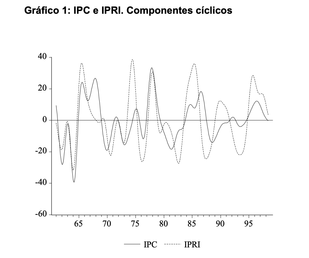 El estudio de la correlación entre el Índice de Precios Industriales y el IPC, señala que la tendencia apunta a que el IPRI se adelanta como 2,5 meses al IPC en su comportamiento.