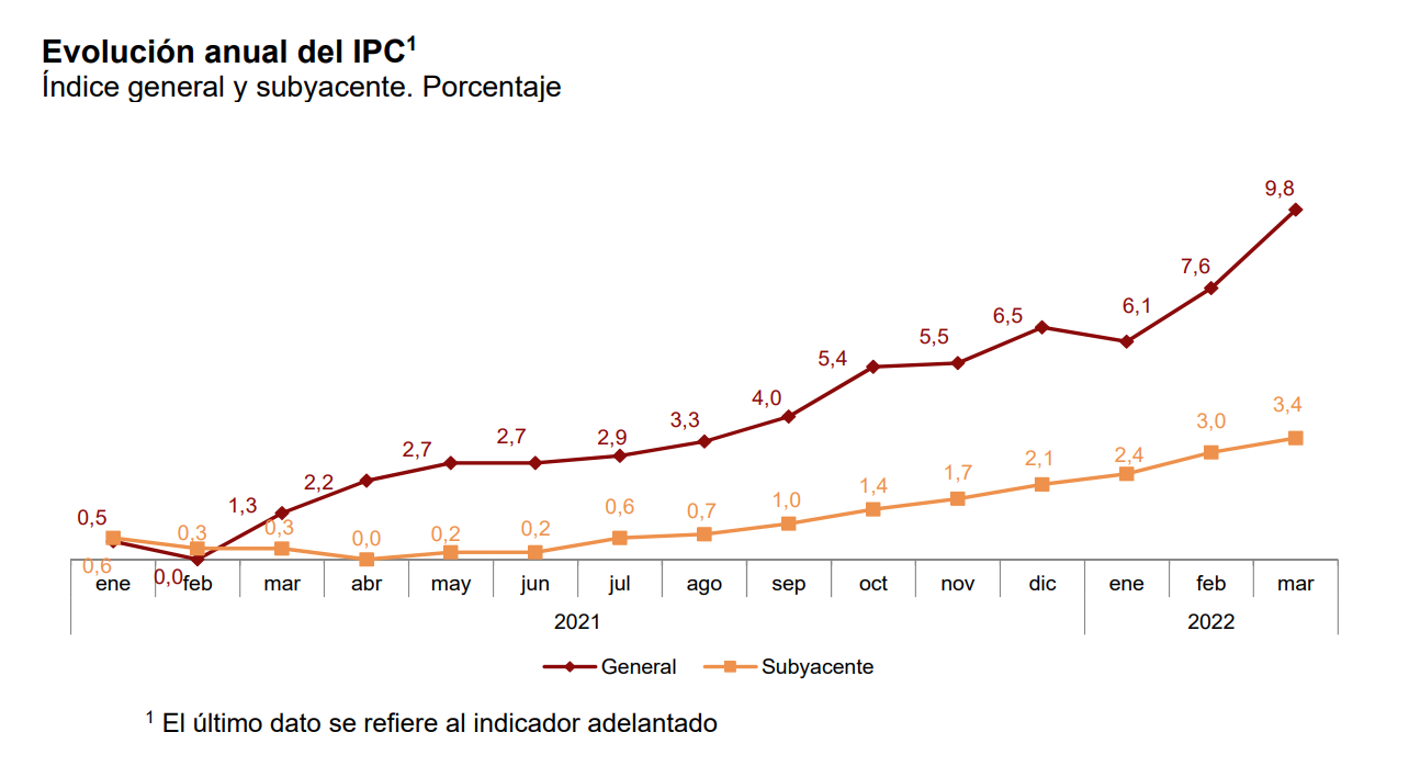 La última tasa de IPC conocida y publicada por el INE, es el dato correspondiente al IPC adelantado del mes de marzo, cuando rozó el 10% (9,8%). Es una tasa no vista en 37 años. Un nivel impensable hace apenas un par de años. En 2019, cuando uno se acercaba a las oficinas de un banco a pedir una hipoteca, los comerciales no dudaban en hacerte simulaciones de evolución de tipos de interés (íntimamente relacionados con la inflación) y ni de lejos veían tipos en el 1% en el próximo lustro. Lo que también hacía pensar que el periodo de inflación moderada o incluso negativa seguiría sine díe. Hoy, las previsiones más optimistas dicen que los tipos de interés de referencia para las hipotecas estarán rozando el 1% el próximo año.