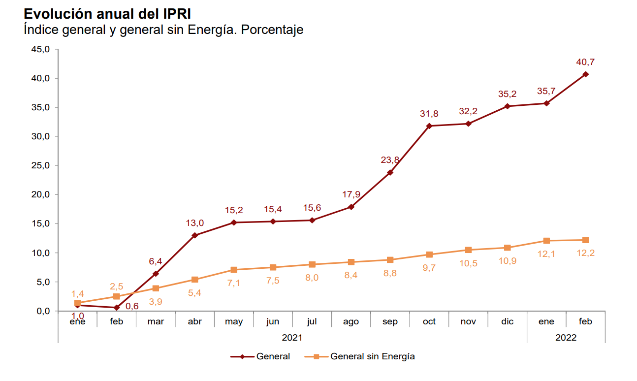 Para aquellos que creen que la tendencia va a moderarse a partir de ahora, habría que indicar que, de ese 35% de diciembre, hemos pasado en febrero al 40,7%, mientras el IPC se quedaba en febrero en el 7,6. No será hasta final de mes cuando conozcamos el impacto en los precios industriales de las tensiones alcistas que sobre los precios energéticos ha acentuado la invasión de Putin, pero todo hace pensar que la tendencia en los precios industriales va a seguir al alza.