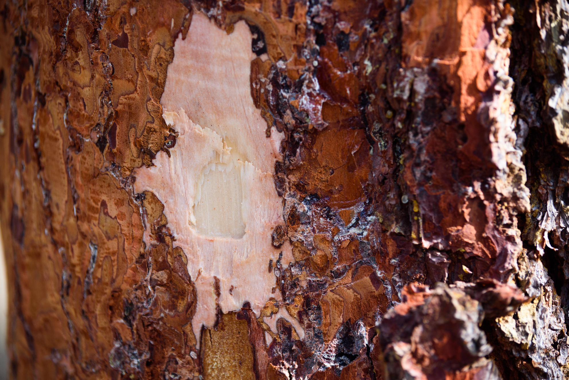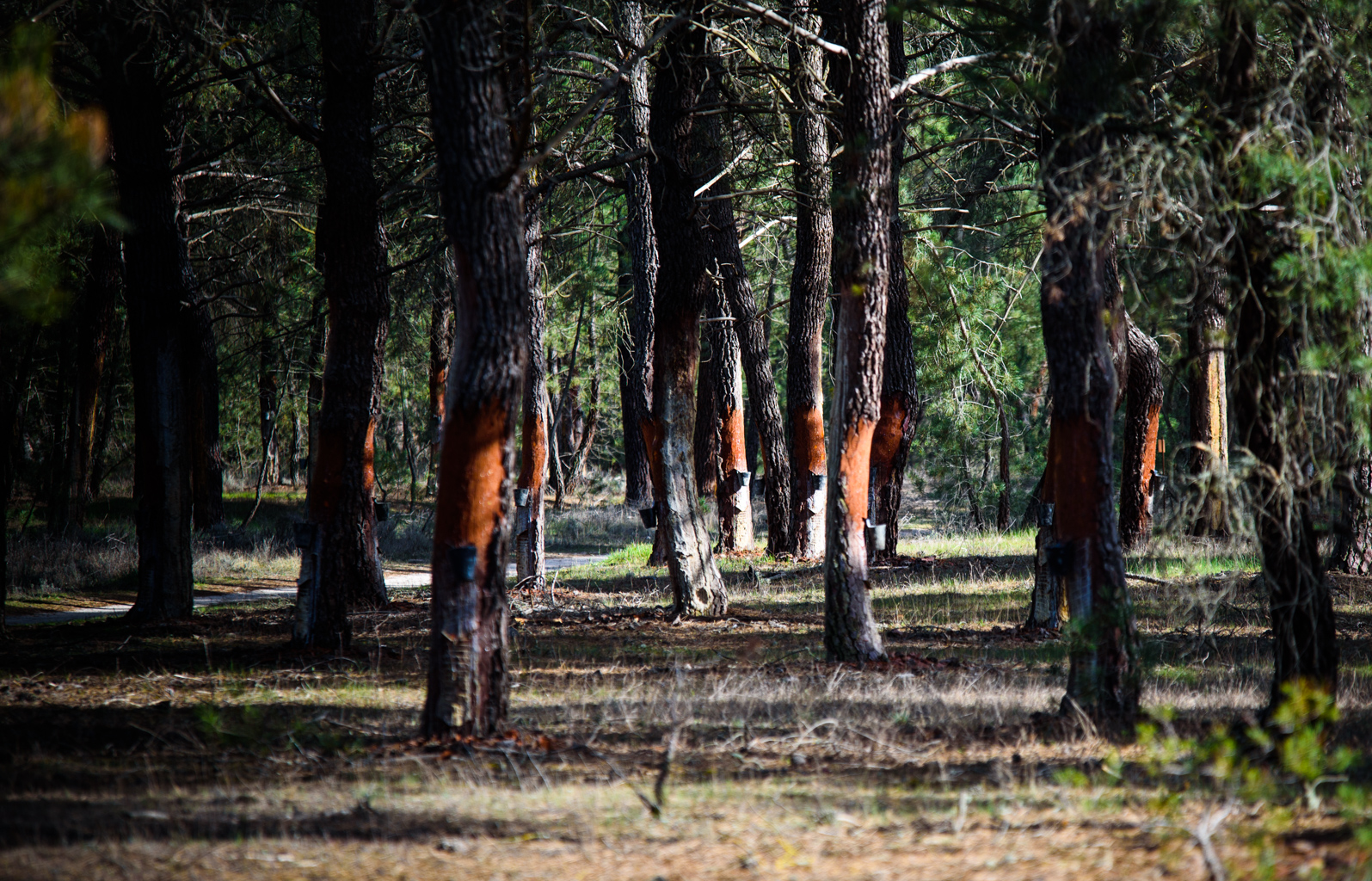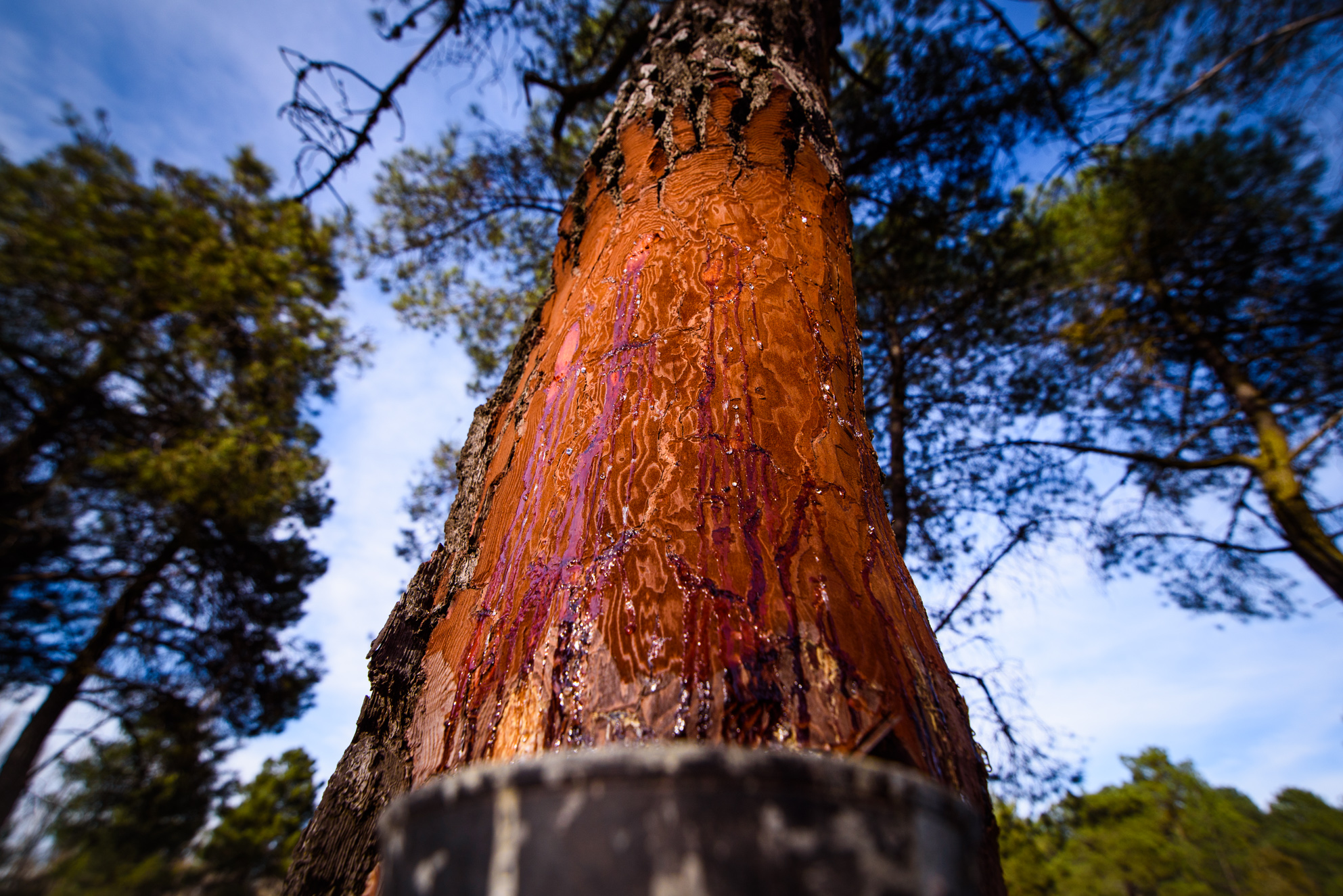 El fundamento de la resinación se basa en realizar incisiones sobre el tronco del árbol, provocando la secreción natural de resina procedente de los canales resiníferos.