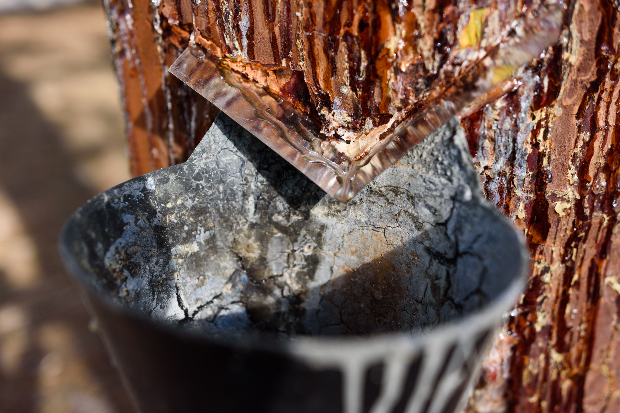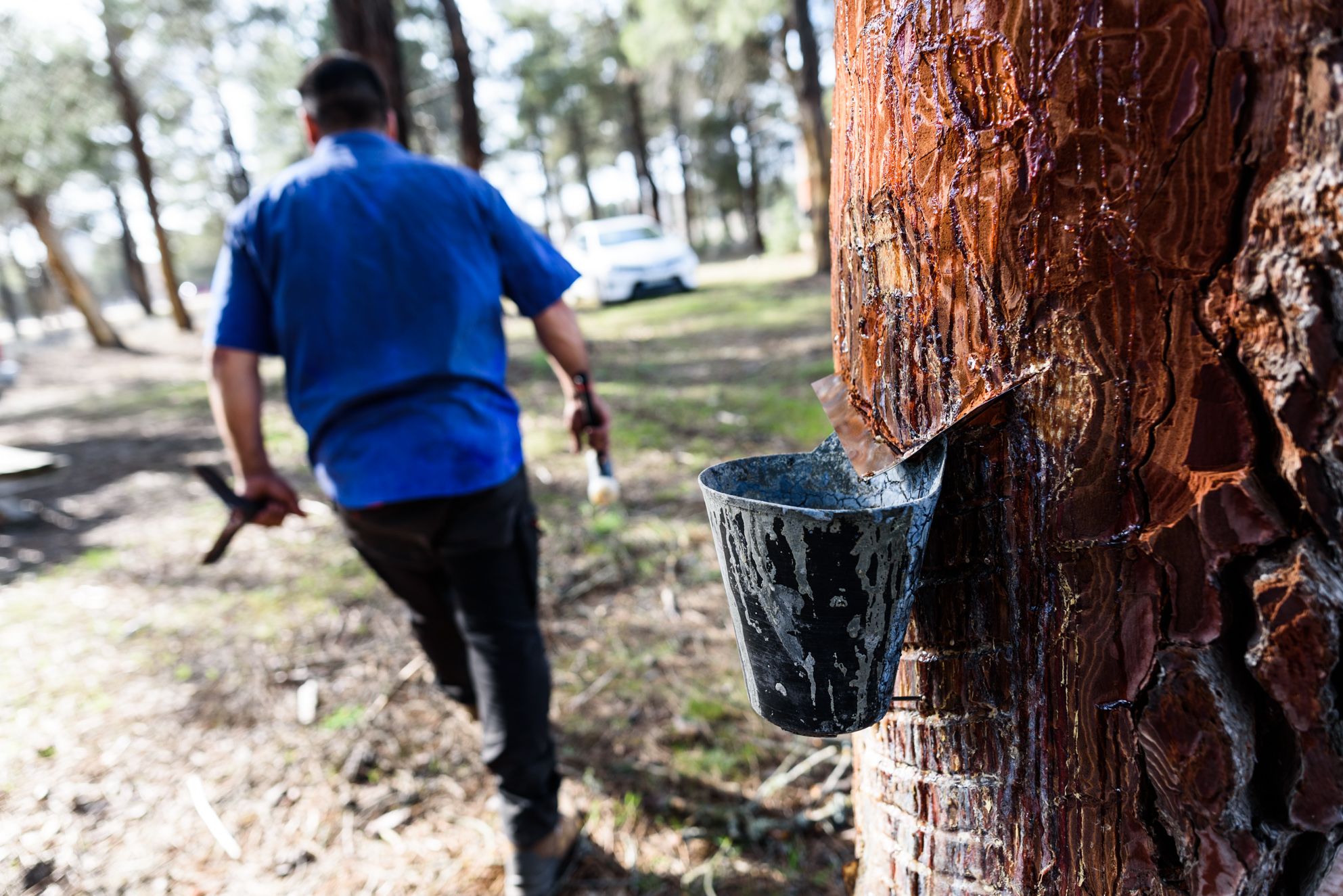 Los extensos pinares de Castilla y León o Castilla la Mancha esconden unos curiosos cuencos enganchados en el tronco de los árboles. Estos son colocados para la recolección de la resina, un recurso forestal estratégico de los pinares españoles. Con un fuerte olor muy característico este es el oro líquido que sale de los árboles y es obtenido por los resineros.