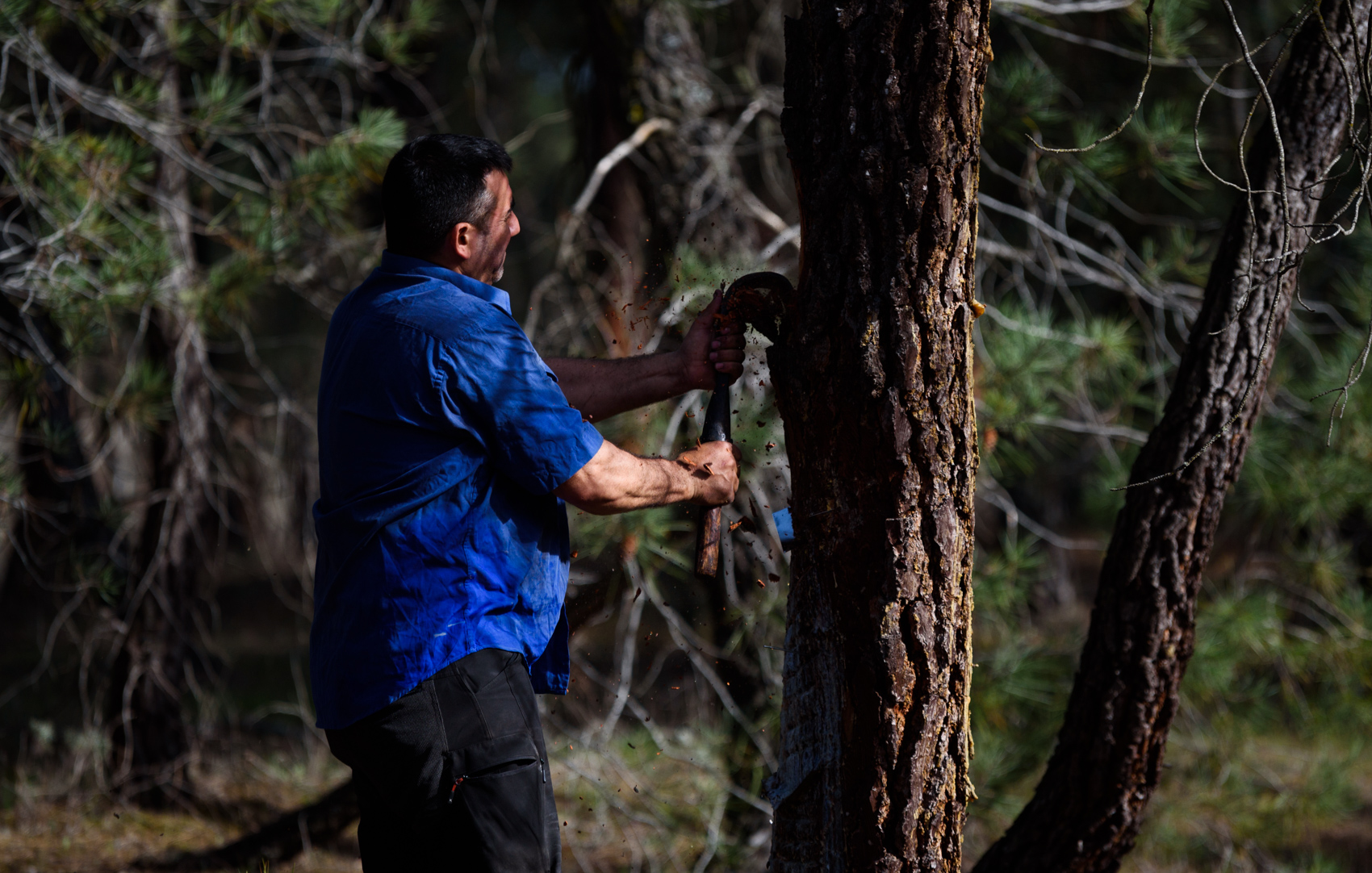 El resinero José Zurdo, trabajando sobre uno de sus pinos en un pinar cerca de la localidad segoviana de Cuéllar.