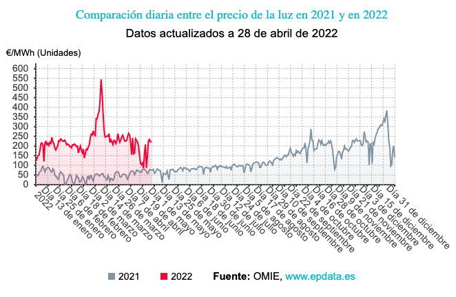 Por su parte, en la evolución del os precios de la luz, la volatilidad del mercado experimentada con el estallido de la guerra de Putin en Ucrania durante el mes de marzo, contrasta con una evolución constante de precios altos de mercado en abril, pero con ausencia de picos como los experimentados el pasado marzo. Así, la media del precio de la electricidad en el mes de marzo fue de 283,30 euros por mwh, el más alto desde que se tienen registros, mientras que la media en lo que va de abril es de 190,87 euros mwh.