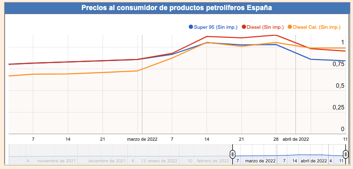 Dice el Instituto Nacional de Estadística que la moderación en el indicador conocido este jueves tiene que ver con la evolución de los precios de la energía y los combustibles. Efectivamente, atendiendo al desempeño de estos dos factores, los precios energéticos se han moderado ligeramente en abril respecto a marzo. En el segundo caso, el de los combustibles, fundamentalmente por la entrada en vigor del decreto del Gobierno que rebaja en 20 céntimos por litro el consumo de combustibles en España que curiosamente entró en vigor el 1 de abril.