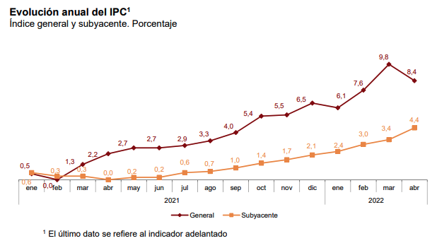 Todo sube. Los precios industriales pulverizan cualquier récord histórico de precios, el recibo de la luz sigue por las nubes, la cesta de la compra acelerada y, por lo que sabemos, los salarios se están disparando, lo que, en términos económicos suponen un acelerador de la inflación. Pese a esta realidad, el IPC adelantado que ofrece el Instituto Nacional de Estadística correspondiente al mes de abril modera el indicador del 9,8% que registró en marzo al 8,4%.