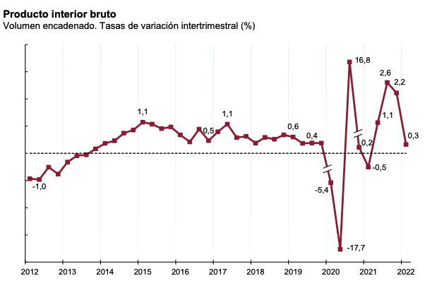 Llama la atención que la nota que ofrece el INE la primera página está dedicada a explicar el comportamiento del indicador que refleja un frenazo en seco de nuestra economía. Alude la nota a que "a los efectos" del covid 19 se le unen los efectos de la guerra de Rusia sobre Ucrania. Sin embargo, al mismo tiempo, señala que la mayoría de los indicadores empleados para calcular el crecimiento del PIB sólo ofrecen datos hasta febrero. El conflicto bélico comenzó a finales de febrero, con lo que los efectos de la guerra todavía no se reflejan en esos indicadores.