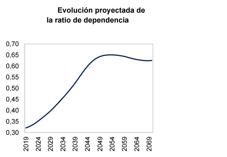 Como puede verse en la imagen de la izquierda (click para ampliar), la tasa de dependencia —relación entre población inactiva y población con un empleo— se va a disparar y hay poco que hacer al respecto. Como se apunta en el informe "la incertidumbre acerca de la evolución descrita de la tasa de dependencia es relativamente baja. Por un lado, incrementos rápidos y sustanciales de la tasa de fertilidad son infrecuentes y, además, tardarían al menos dos décadas en trasladarse a la ratio de dependencia. Por otro lado, las tasas de mortalidad son también relativamente estables en el tiempo y su tendencia es, en todo caso, a la baja. La mayor fuente de incertidumbre en la evolución de la ratio de dependencia procede de la proyección de los flujos migratorios netos, pero su capacidad para mejorar la ratio de dependencia es transitoria". En resumen, que ni siquiera con una inmigración neta positiva relevante (algo que ya anticipan todos los estudios, incluido éste), nos libraremos de un futuro complicado desde un punto de vista financiero.