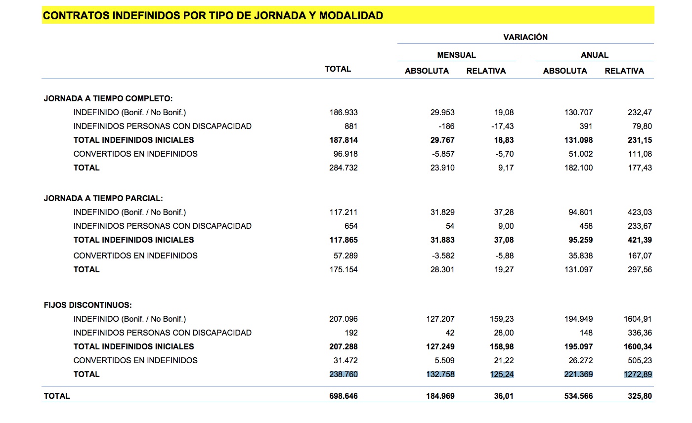 Además, como también se observa en la tabla, de los 700.000 contratos indefinidos de los que alardea el Gobierno, 175.154 son a tiempo parcial, el 25%, que sumados a los 238.760 fijos-discontinuos hacen que el 60% de los nuevos contratos fijos firmados sean tan precarios como antes.