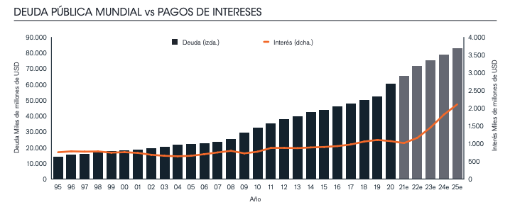 La única parte positiva es que en 2021 los costes del servicio de la deuda (los intereses) mundiales se mantuvieron bajos, cosa que cambiará en 2022, merced a las anunciadas subidas de tipos de interés.