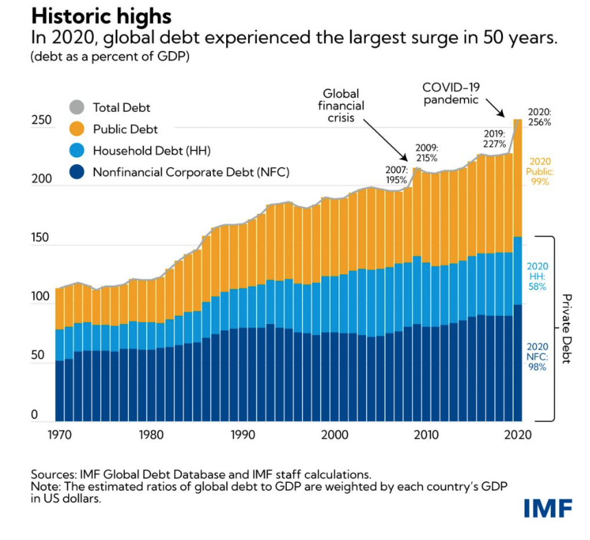 Desde 2007, la deuda pública mundial aumento del 70% del PIB en aquel año al 124% del PIB en 2020. La deuda privada lo hizo a un ritmo más moderado del 164% del PIB en 2007 al 178% en 2020.