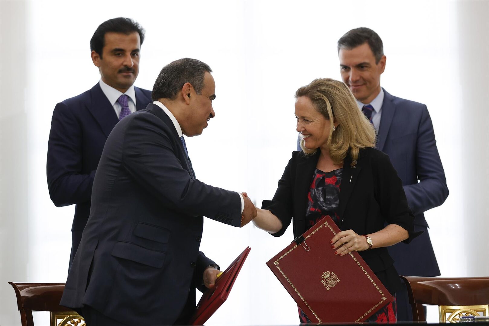 El colofón de la visita del emir de Qatar a España, donde ha sido recibido con los máximos honores, ha sido la firma de varios acuerdos que incluyen un compromiso de nuevas inversiones del emirato por unos 4.720 millones de euros. Entre los muchos ministros presentes en la rúbrica de los documentos ha estado la vicepresidenta y ministra de Asuntos Económicos, Nadia Calviño, que ha sido captada por las cámaras firmando junto a su homólogo qatarí, Ali bin Ahmed Al Kuwari, el emir de Qatar, Tamim bin Hamad Al Thani y el presidente del Gobierno, Pedro Sánchez.
