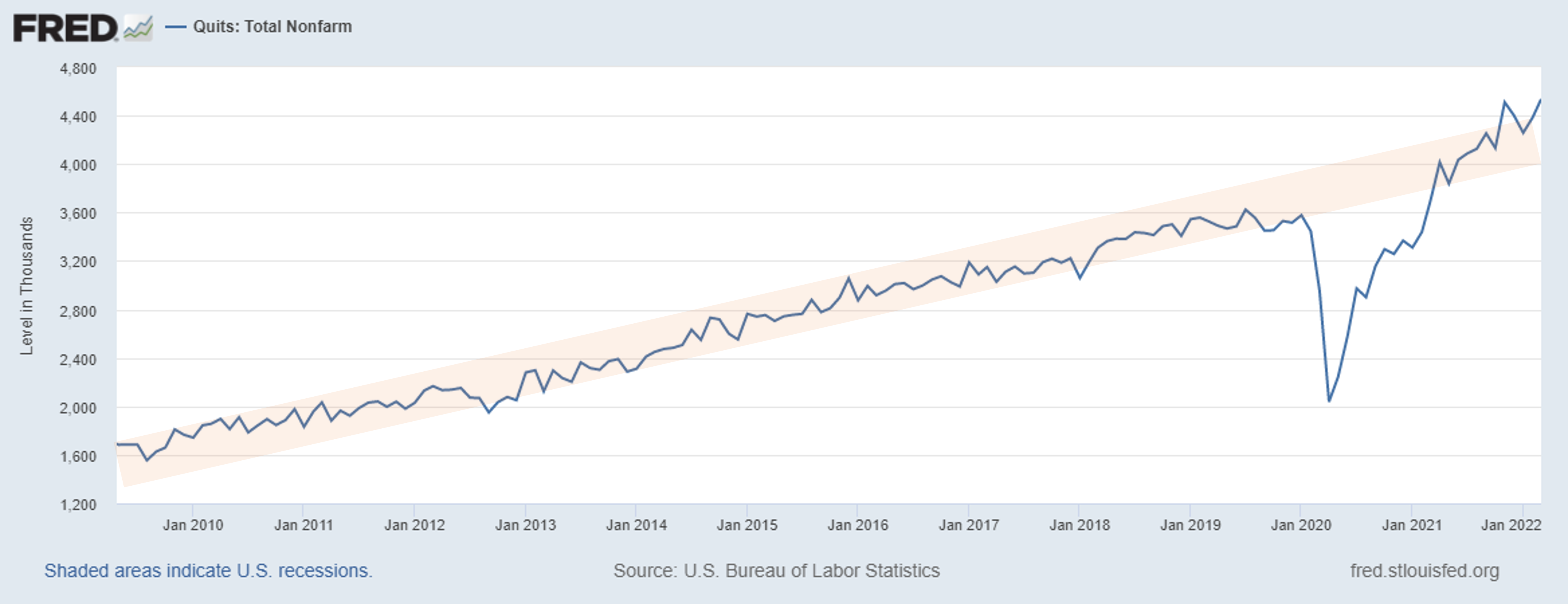 En primer lugar, debemos tener en cuenta que el nivel de desempleo en EEUU ha caído sin cesar, precisamente, desde el año 2010 (con la salvedad de la pandemia). Esta relación no es ni mucho menos casual, ya que las situaciones cercanas al pleno empleo incentivan a los trabajadores a buscar oportunidades mejores sin el miedo de mantenerse en el paro por largos periodos de tiempo. Además, este fenómeno potencia que sean los empresarios quienes compitan entre sí por ofrecer mejores condiciones a los empleados, impulsando al alza los salarios.