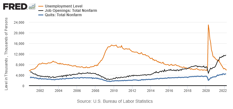 Al observar la evolución histórica, podemos percatarnos de que las renuncias (línea azul en el gráfico posterior) se han elevado en los últimos dos años a niveles máximos de este siglo. Todo ello, al mismo tiempo que la tasa de paro se ha desplomado (línea naranja) y las ofertas de trabajo (línea negra) aumentan hasta niveles nunca vistos. Consecuentemente, los puestos ofertados se sitúan sensiblemente por encima de las personas que buscan empleo. Sencillamente, los números no cuadran, y esto está generando millones de puestos vacantes.