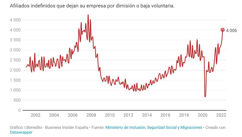 Pese a que, como hemos constatado anteriormente, el nivel de dimisiones en Estados Unidos se sitúa en niveles récord, lo cierto la tendencia de incremento lleva vigente desde hace mucho tiempo. Concretamente, el número de renuncias no ha parado de aumentar a ritmo estable desde el año 2010. Sí, es cierto que desde el 2021 las dimisiones se han disparado a una velocidad mayor, pero como compensación de la caída previa durante los primeros meses de la pandemia.