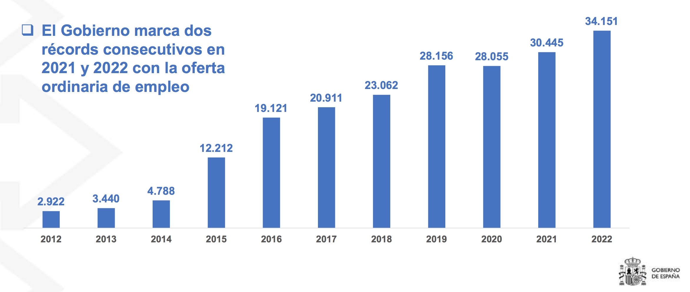 El empleo público vuelve a crecer. El Gobierno ha lanzado otro récord de vacantes para funcionarios que alcanza la desorbitada cifra de las 44.787 plazas en 2022. Nunca antes en la historia de España se había aprobado una oferta de empleo público (OEP) de estas dimensiones.
