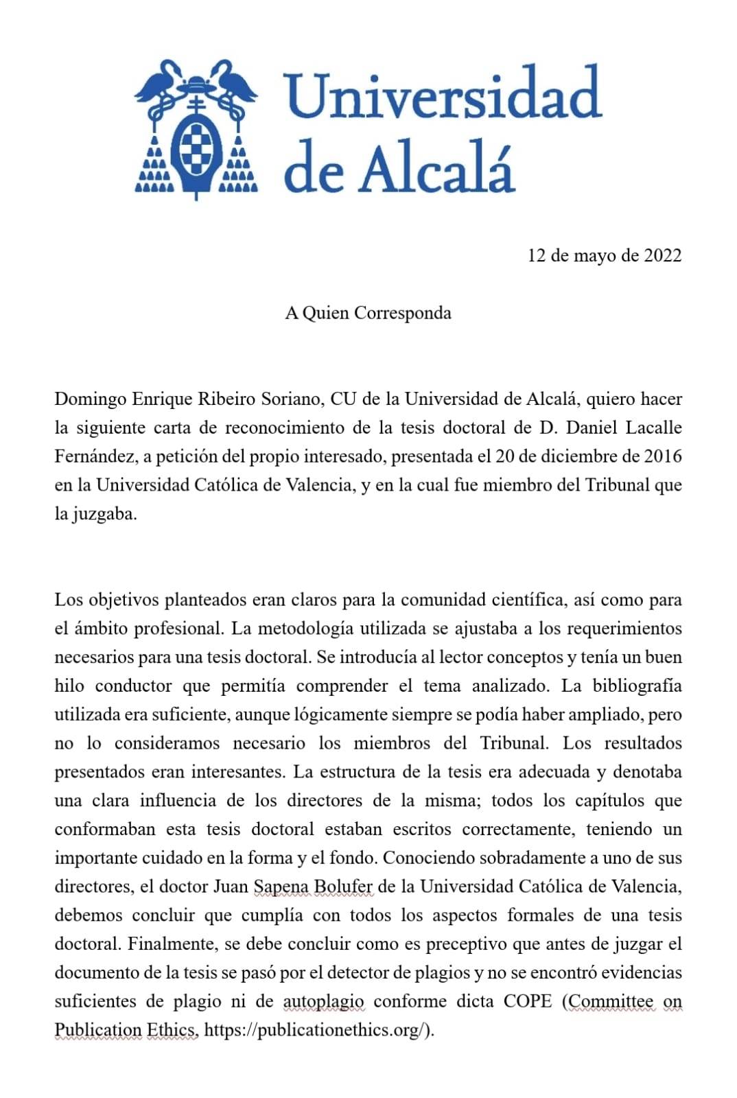 Otro de los miembros del jurado encargado de evaluar la tesis, el catedrático universitario Domingo Enrique Ribeiro-Soriano, ha comunicado por escrito que no encontraron tacha alguna en el trabajo de Lacalle, que su estructura era adecuada y en la misma se traslucía la influencia de los directores de la misma. Concluye Ribeiro Soriano que cumplía con todos los aspectos formales de una tesis doctoral y recuerda que, antes de juzgar el documento de la tesis, se pasó por el detector de plagios y no se encontraron evidencias suficientes de plagio o de autoplagio conforme dicta el comité de ética en las publicaciones (Committee on Publication Ethics, https://piblicationethics.org).