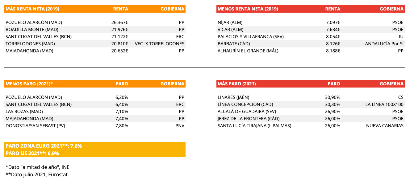 En la tabla que se muestra a continuación puede cotejarse la posición de los municipios españoles con mayor y menor renta media por habitante, así como las localidades con menor y mayor tasa de desempleo, indicándose el partido gobernante en cada ayuntamiento. El fracaso de la izquierda en materia laboral es estrepitoso.