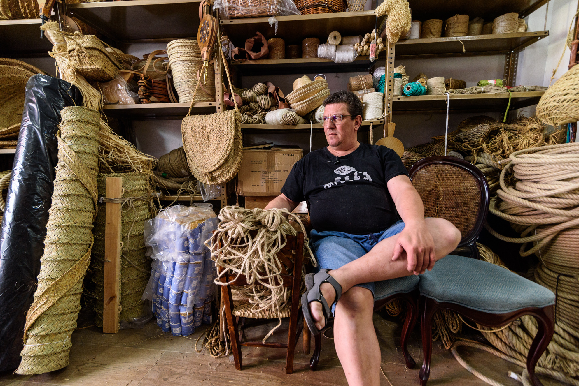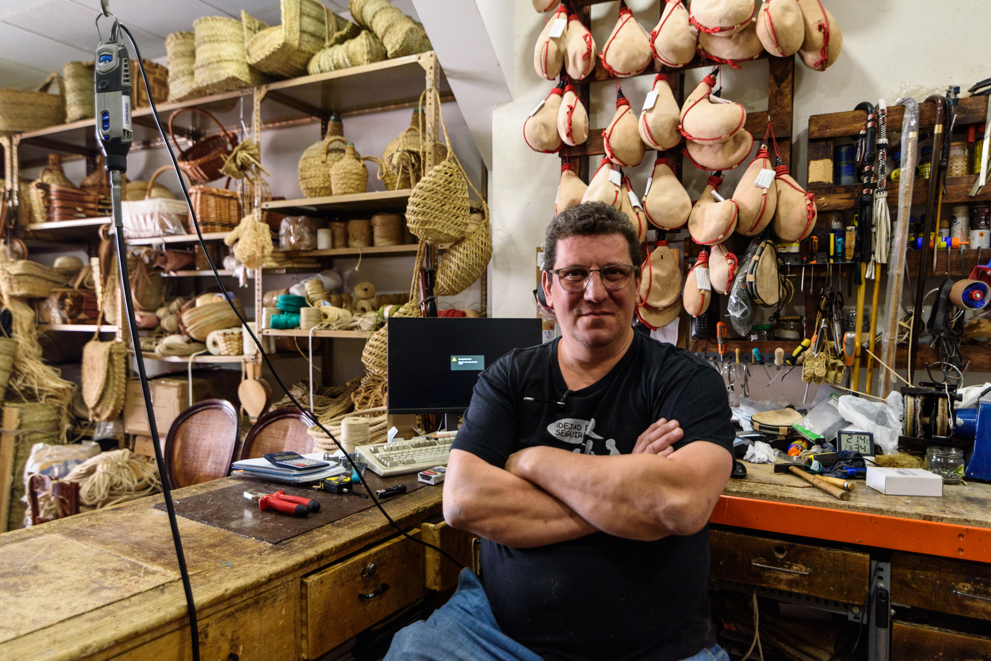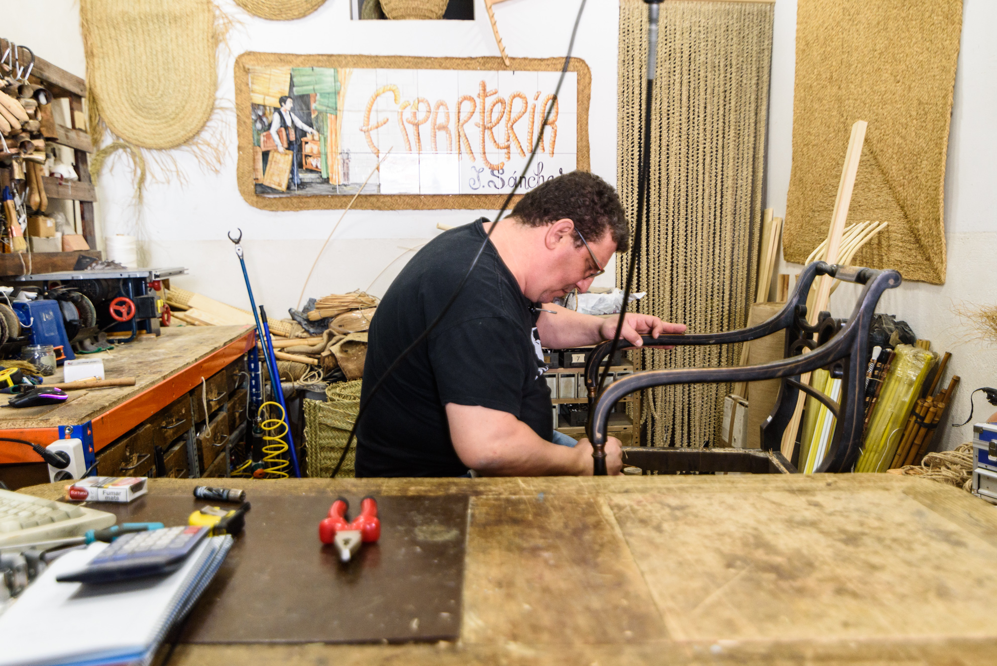 Juan Sánchez es el último espartero artesanal que queda en Madrid. En su tienda, antigua sillería madrileña, además de vender productos hechos con esparto, también repara otros para sus clientes.