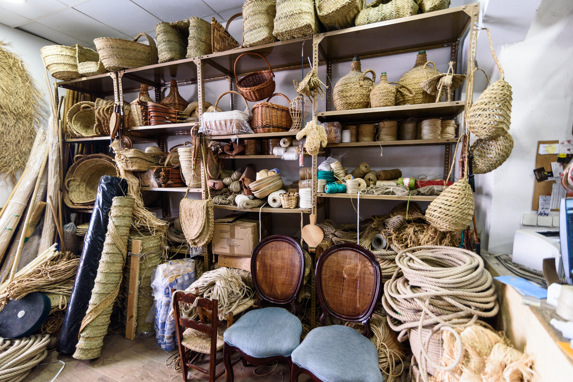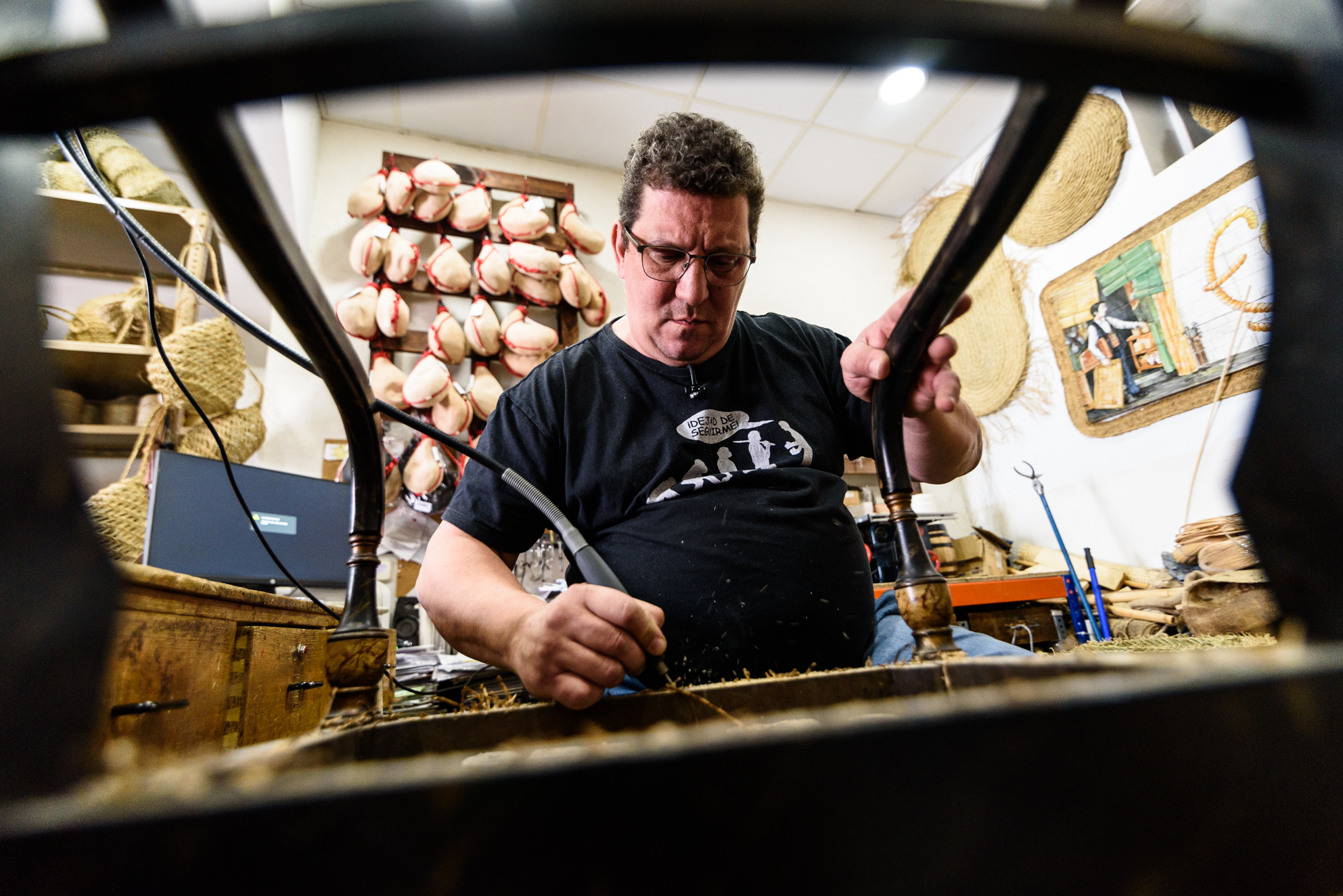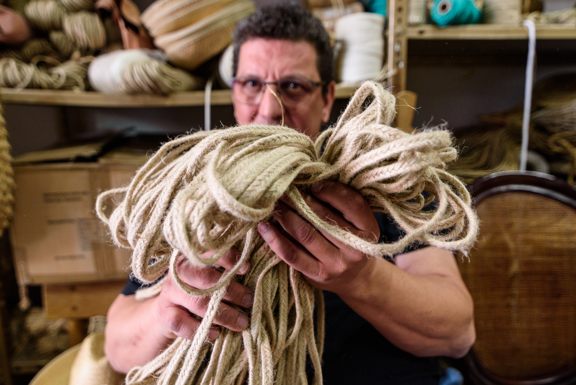 Juan Sánchez es el último espartero artesanal que queda en Madrid. En su tienda, antigua sillería madrileña, además de vender productos hechos con esparto, también repara otros para sus clientes.