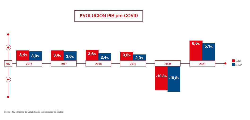 La economía de la Comunidad de Madrid creció un 0,8% en el primer trimestre de 2022, casi el triple que la media de España, que se quedó en el 0,3%, según los datos de la Contabilidad Regional de este periodo. Este crecimiento se suma al experimentado en el año 2021, cuando la economía madrileña aumentó su PIB en un 5,2%.