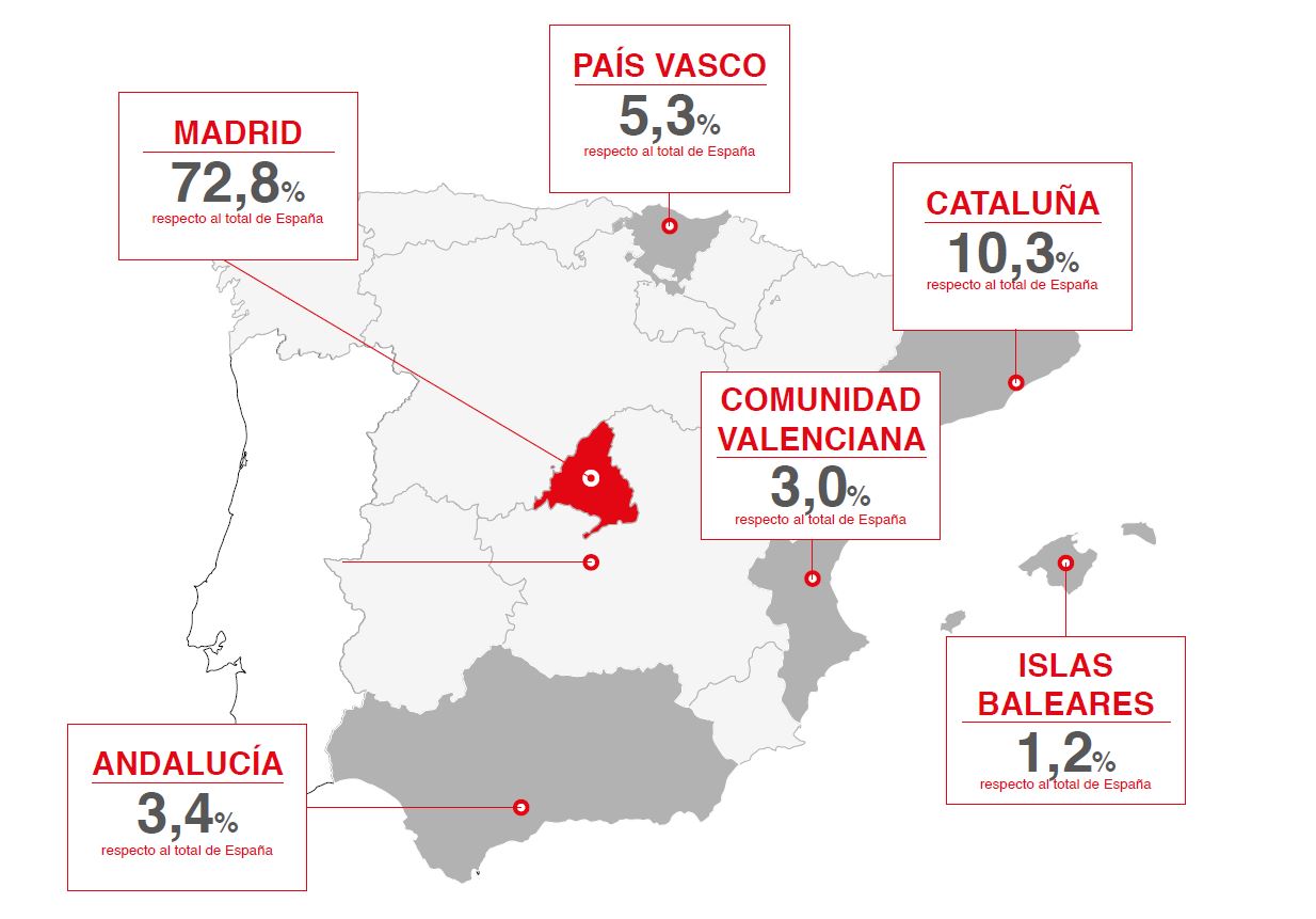 Los datos presentados por la Comunidad refuerzan la posición de Madrid como el gran motor económico de España, aportando hasta el 19,3% del PIB, lo que se refleja, entre otras variables en la creación de empresas: más de 6.400 nuevas sociedades en el primer trimestre del año. Se trata del 22,6% del total nacional y casi el 40% del capital suscrito. Asimismo, la Comunidad de Madrid acumula el 72,8% de la inversión extranjera recibida en España, aglutinando en 2021 casi 21.000 millones de euros. A considerable distancia, completan el podio Cataluña (10,3%) y País Vasco (5,3%).