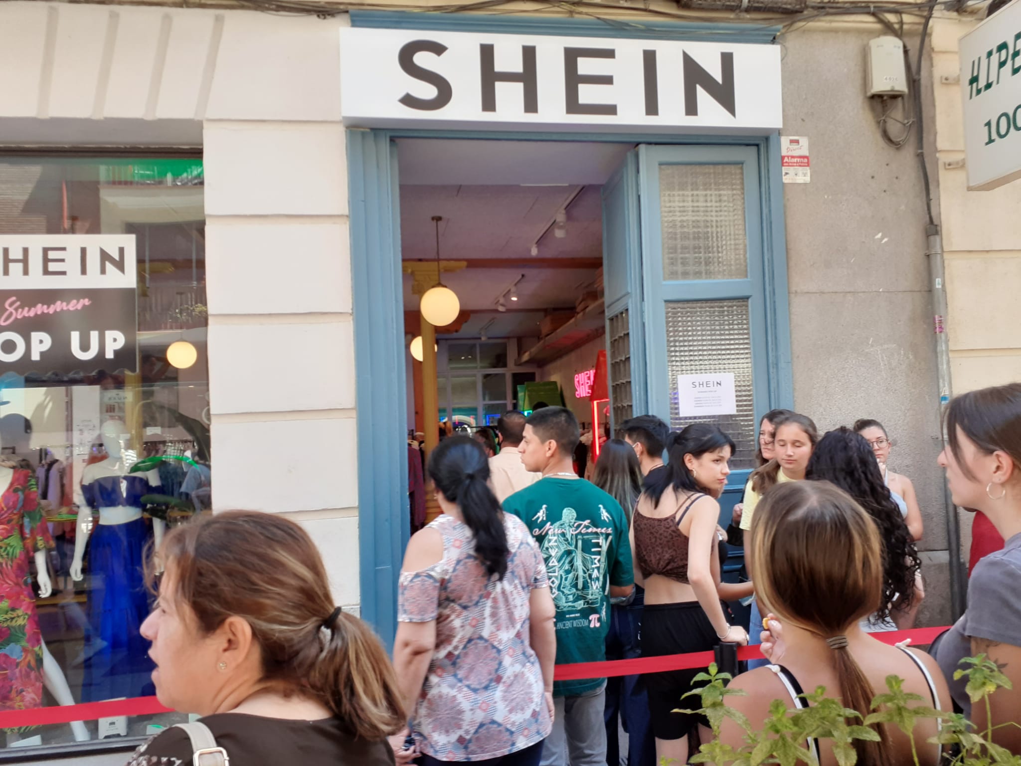 La famosa tienda de ropa por Internet Shein ha abierto una pop up store, una tienda física que solo dura unos pocos días en Madrid, en la calle Sandoval. Antes de su apertura, anunciada a las 14:00 horas, la cola, fundamentalmente formada por mujeres, llegaba más allá de la calle Carranza, según testigos presenciales. La gente se aglomeraba a pleno sol y exponiéndose al tráfico para poder acceder al local, al que un testigo calcula que podrá entrar sobre las siete de la tarde.