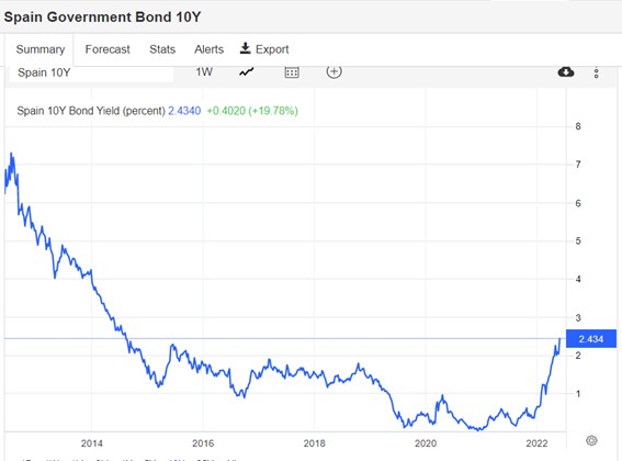 En los primeros días de junio los mercados de renta variable (especialmente el norteamericano) están dando un respiro. La situación empezaba a preocupar. Ahora, con la subida de tipos y la retirada (gradual) de estímulos por parte de la FED, veremos cómo reaccionan los mercados de renta fija. Por el momento, Italia ya tiene una prima de riesgo en 200 puntos básicos y las rentabilidades exigidas a los bonos del tesoro están subiendo a ritmos no vistos desde hace décadas: Bono a 10 años en Alemania en el 1,23% (algo no visto desde 2014, antes del QE), en Italia al 3,24%, España en el 2,34% (también máximos desde 2014)…
