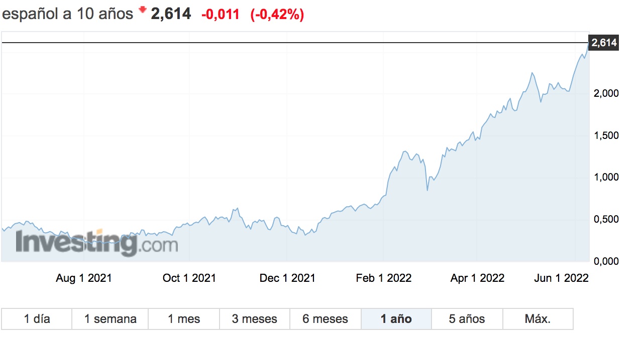 Así, la deuda pública española comienza también a ser castigada, aunque la intención del BCE de contener la subida de tipos haya sido evitar ese castigo. A cierre de sesión, el rendimiento del bono español a diez años se situaba por encima del 2,61%, el mayor desde 2014, lo que supone casi multiplicar por 8 el 0,39% de hace un año. La prima de riesgo española cotizaba en 118 puntos básicos, cuando hace un año estaba por debajo de los 70 puntos básicos.