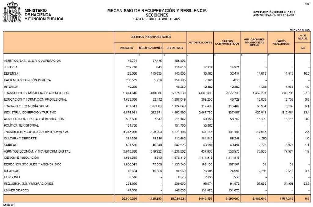 La falta de transparencia impide que podamos conocer cuál es el grado de ejecución real, lo que realmente llega a las empresas. La ministra Calviño sólo sabe decir que en 2022 estamos alcanzando velocidad de crucero. Debe ser un crucero de juguete, porque según el último informe de la IGAE a 30 de abril, de 28.025 millones en créditos definitivos del mecanismo de recuperación para 2022, se habrían pagado tan sólo 1.587 millones, en su gran mayoría, transferencias a las CCAA, es decir, sin llegar al tejido productivo.