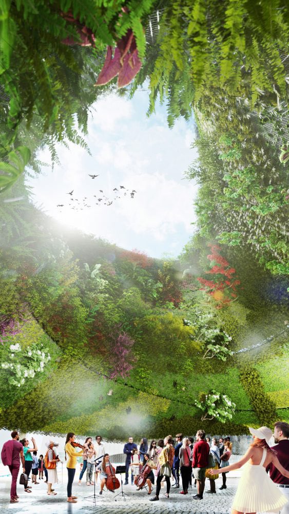La propuesta de WEST 8 y Porras Guadiana apuesta por crear un gran bosque urbano cuya identidad está ligada a la memoria del lugar, levantándose sobre la losa que cubrirá el haz de vías que durante décadas ha ocupado este espacio de Chamartín.