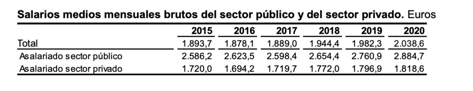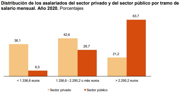 El salario medio bruto de los funcionarios se situó en 2.884 euros, frente a los 1.818 euros de los empleados del sector privado, una diferencia abismal.
