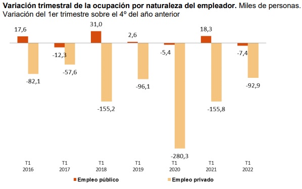 Según los últimos datos de empleo publicados por el INE, España ha marcado un nuevo récord de empleo público: 3.468.000 asalariados en plena ola inflacionista. En los 12 últimos meses, la ocupación ha aumentado en 807.200 personas en el sector privado y en 70.700 en el público.