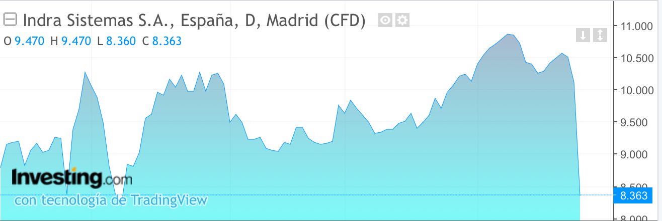 Justo después de la apertura de la bolsa, Indra cotizaba en 8,5 euros por título, lo que suponía un descenso superior al 16,.09% respecto al cierre de este jueves.